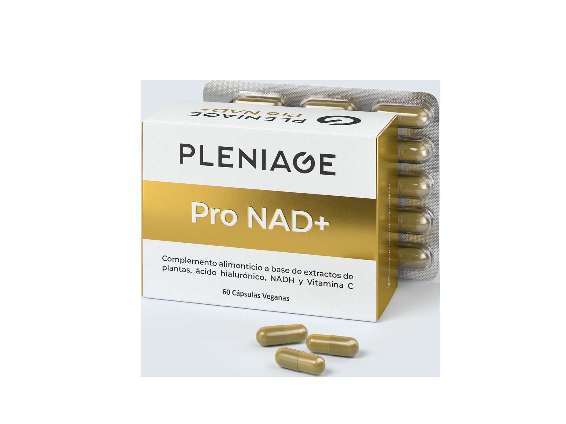 PLENIAGE® PRO NAD+ es un suplemento formulado para apoyar la producción de energía celular y los procesos de reparación que disminuyen con la edad. Su fórmula avanzada combina NADH (Beta-NAD reducido) con una tríada exclusiva de polifenoles bioactivos —Resveratrol (de Polygonum cuspidatum), Berberina y Quercetina— enriquecida con Ácido Hialurónico y Vitamina C, que contribuye a la protección de las células frente al daño oxidativo y al metabolismo energético normal.